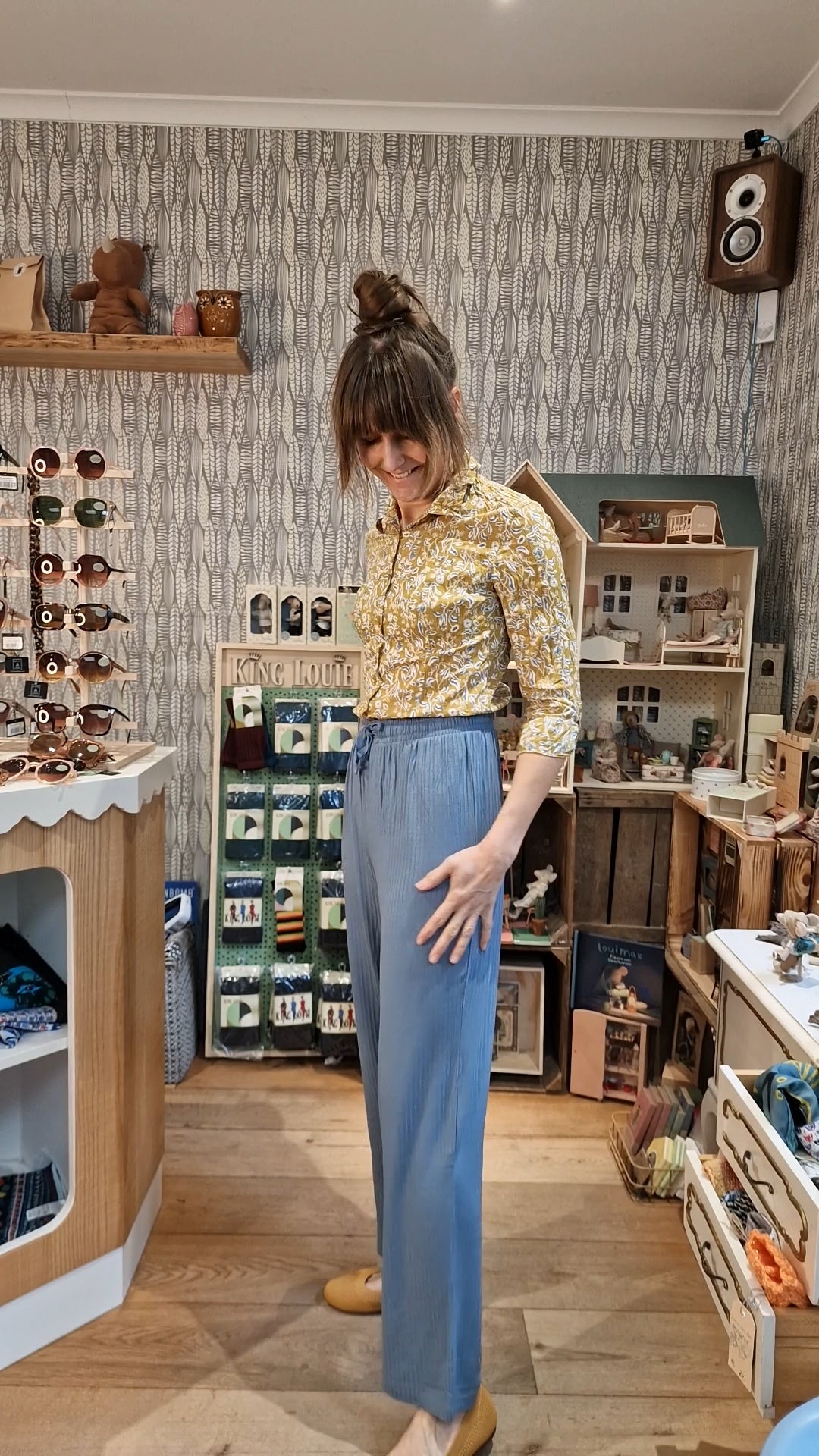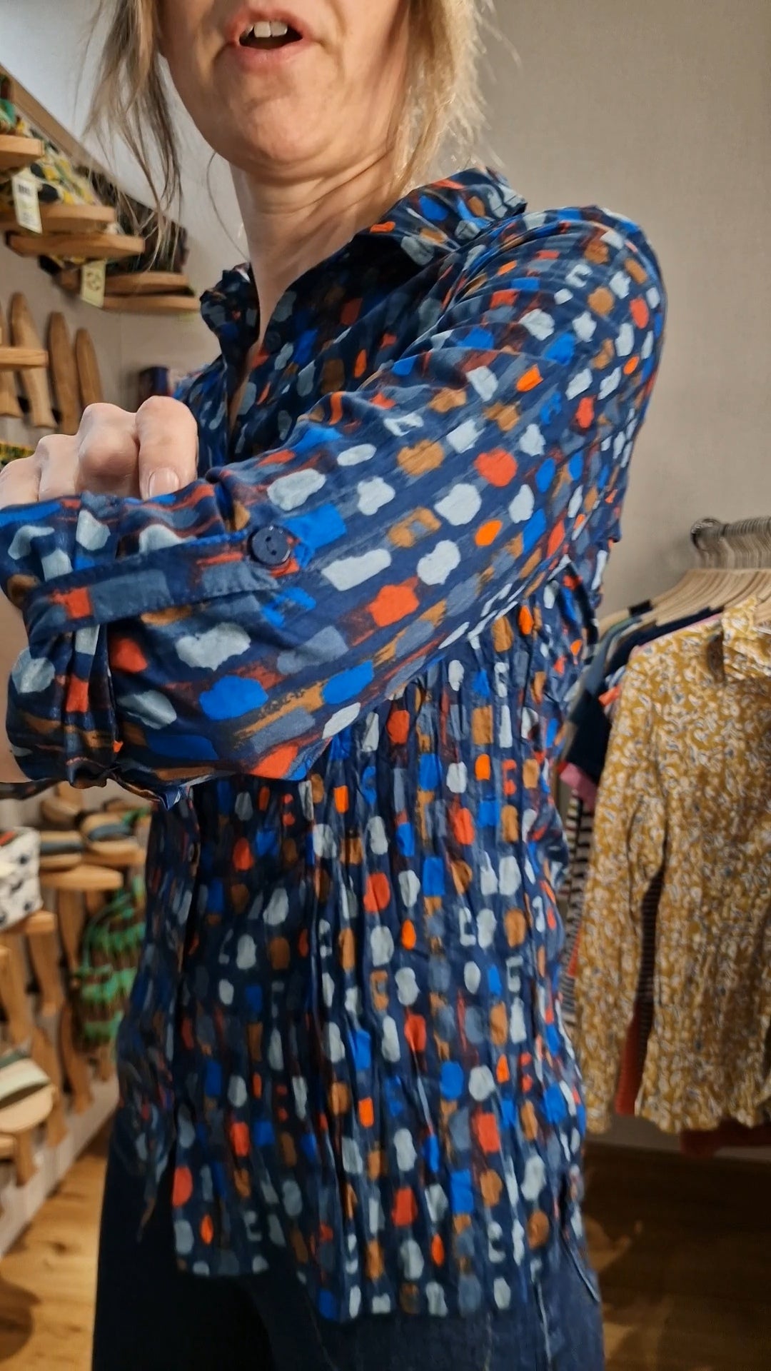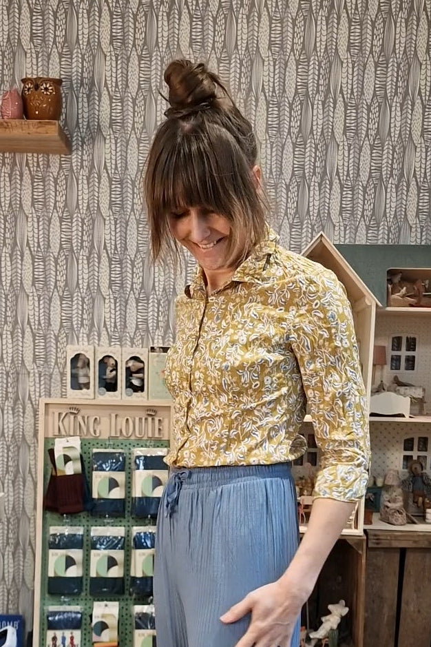 Unsere Lieblingsbluse Larissa hat einen lässigen Crinkle-Look. Nach dem Waschen einfach eindrehen und trocknen lassen – kein Bügeln:)