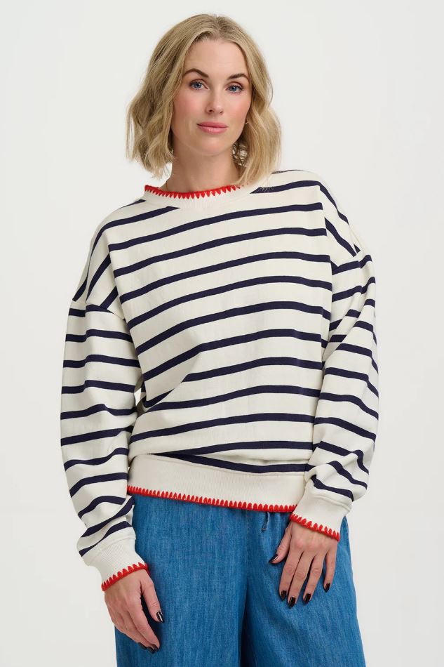 Sweatshirt - Noah Relaxed Sweatshirt - Off White/Navy, Embroidery Trim